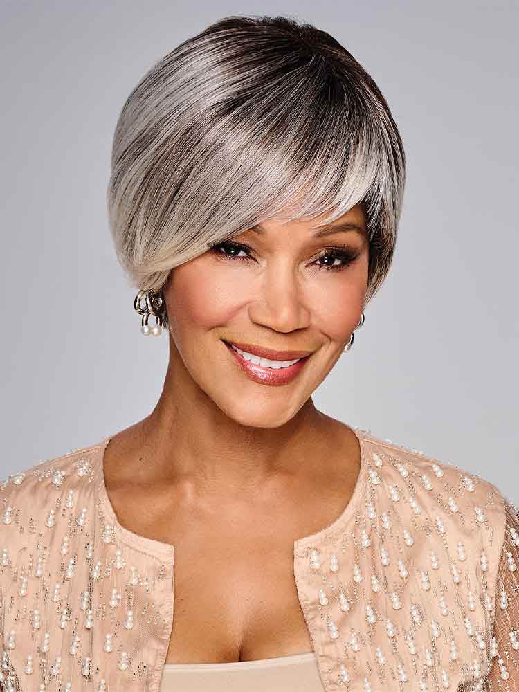The Anastasia wig by Kim Kimble is an asymmetrical cut has shattered texture throughout, and long, side-swept fringe for a touch of regal sophistication.