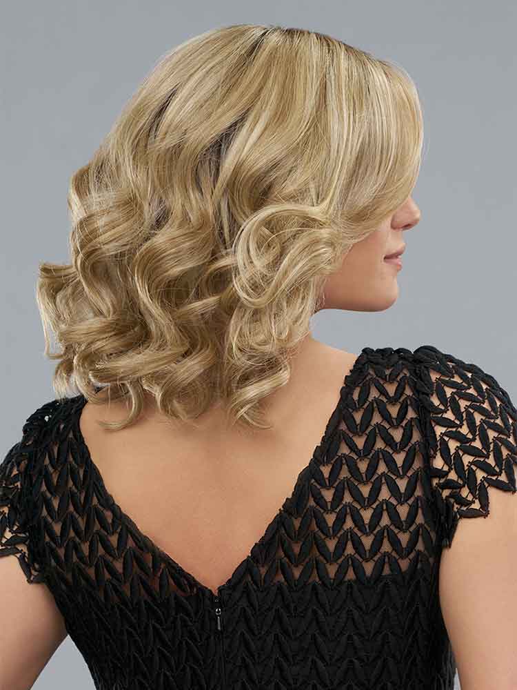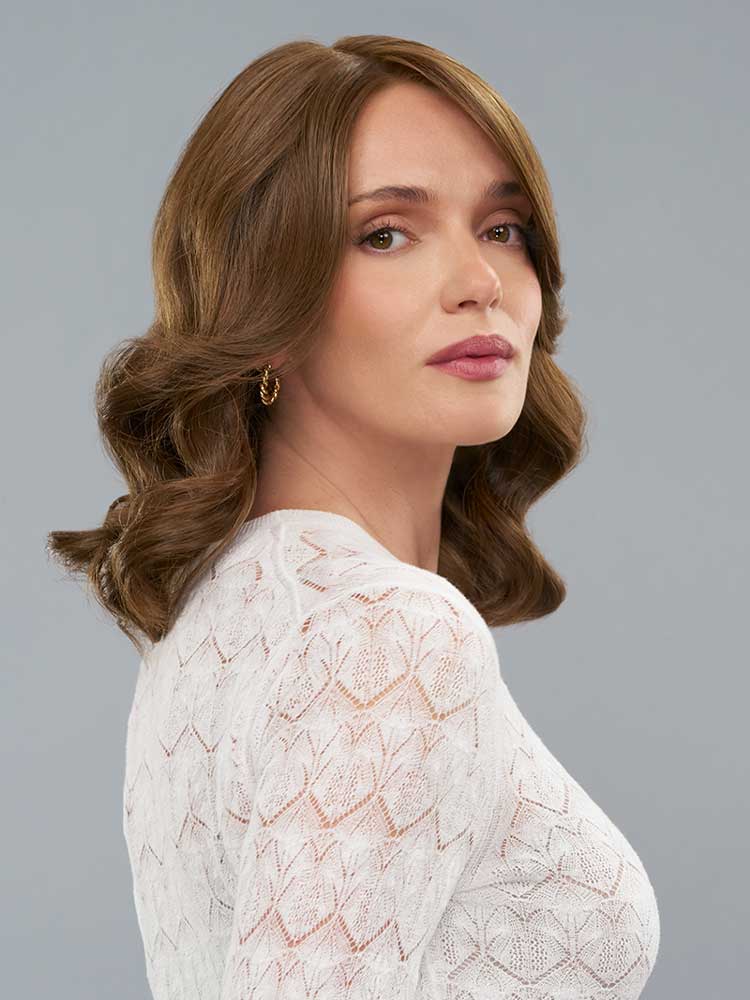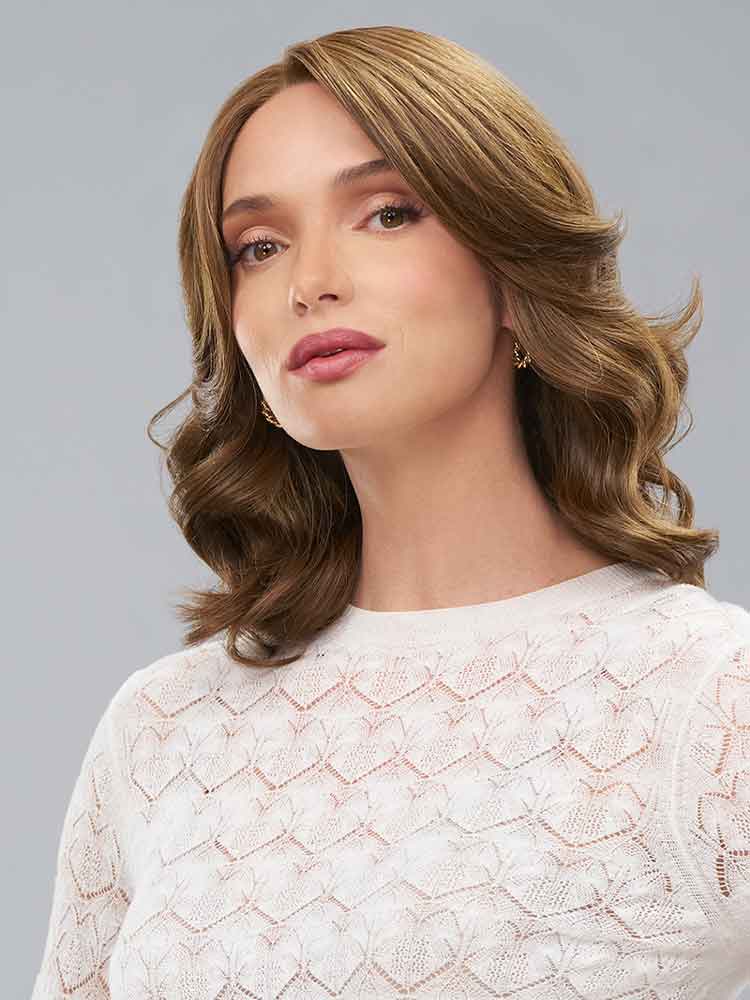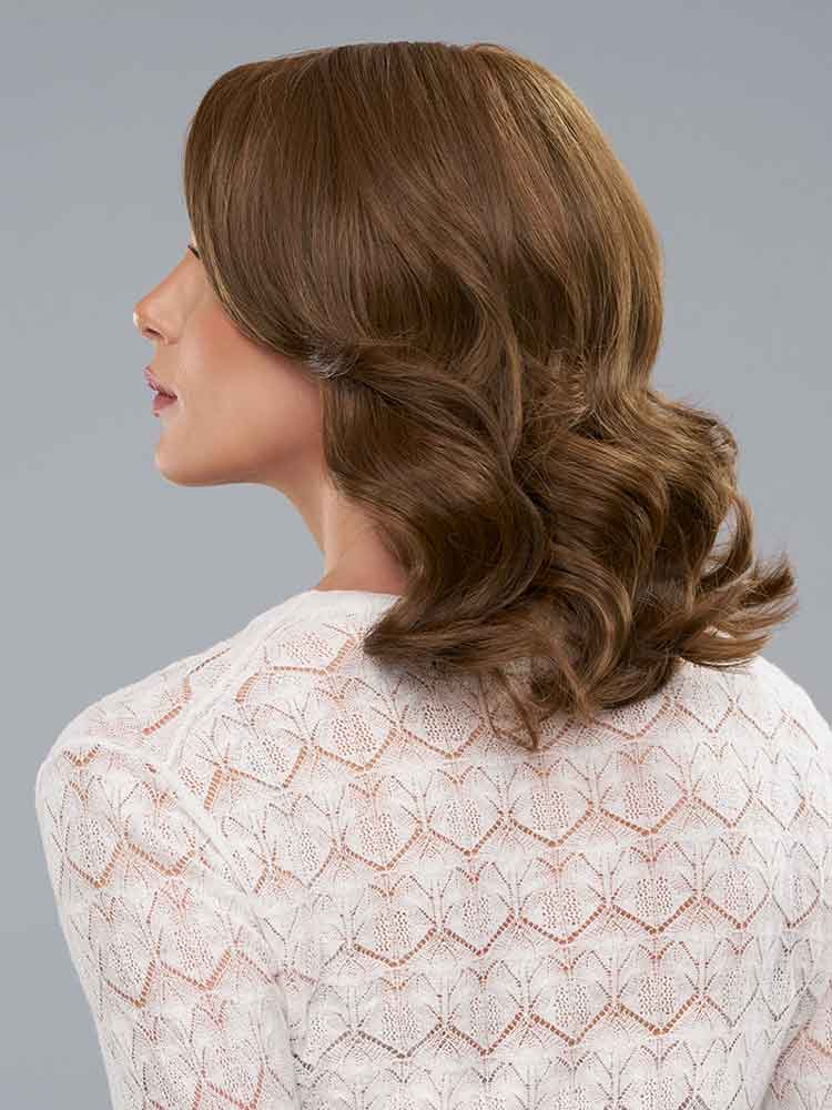 The Aurora wig by Jon Renau a mid-length style that exudes sophistication and refinement. Crafted with luxurious barrel curls.