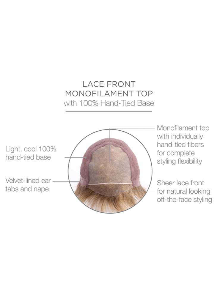 The 100% hand-tied cap features a Sheer Indulgence Lace Front that creates a natural looking hairline and offers many styling options.