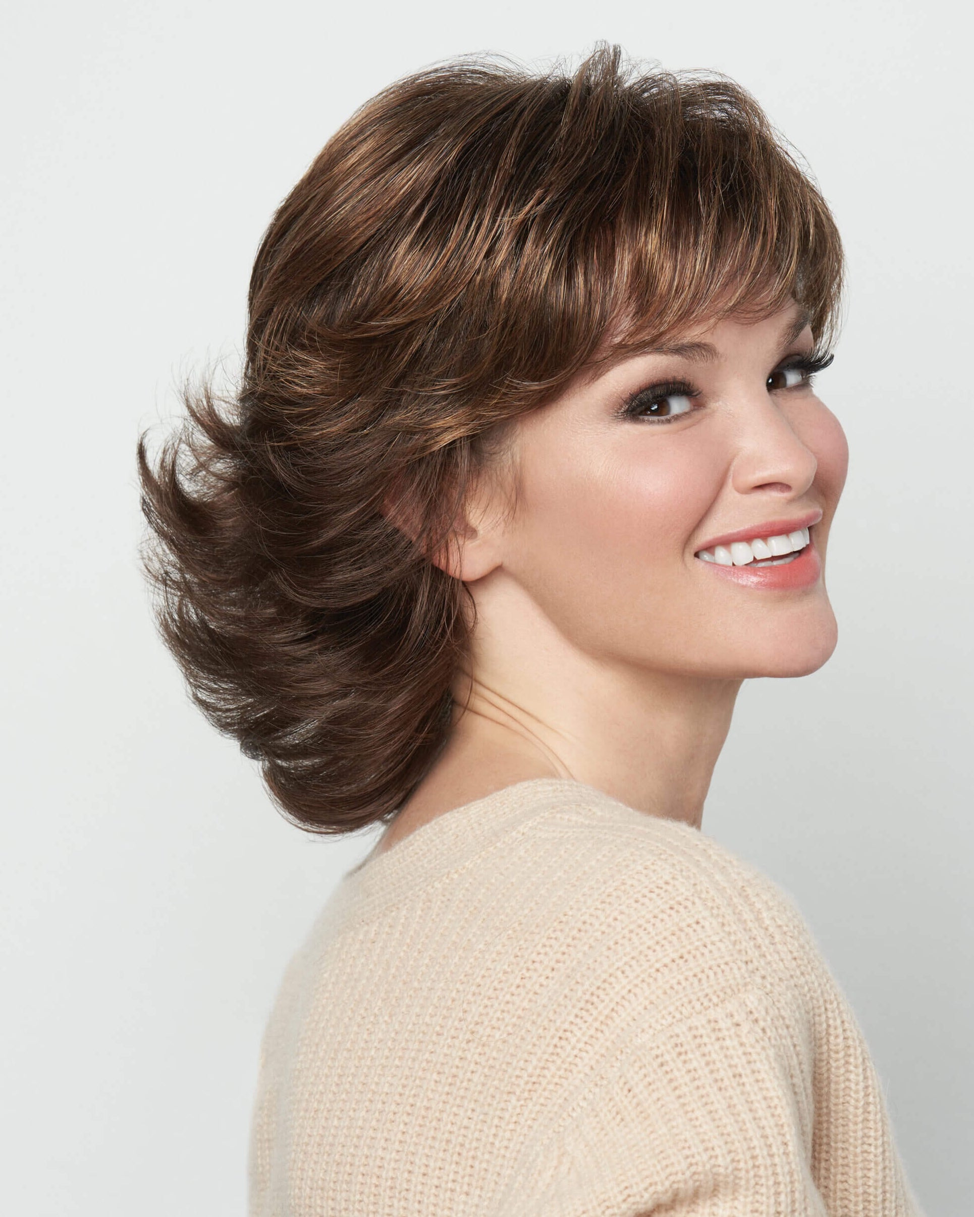 The Breeze wig by Raquel Welch is beautifully flicked out with textured and face-framing layers. Simply give it a quick shake out of the box to boost volume and to accentuate the layers.