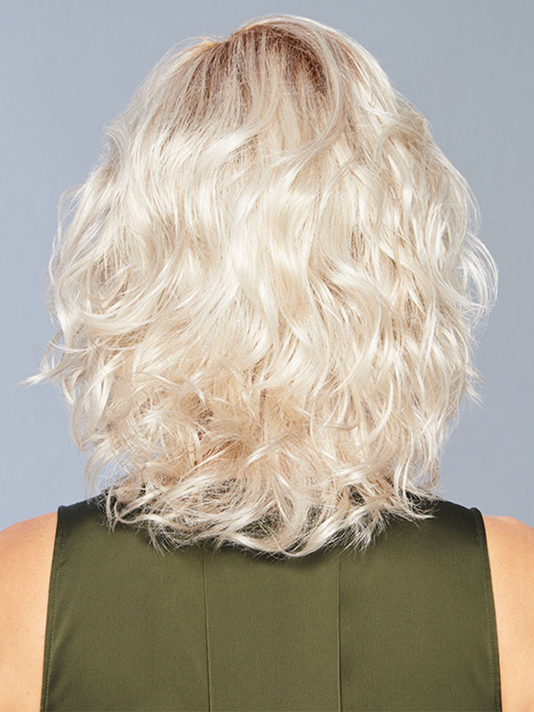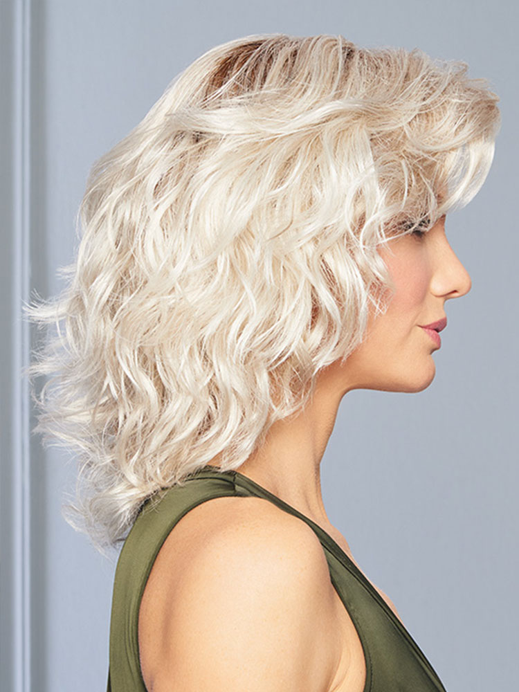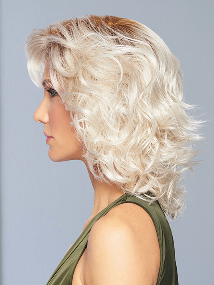 The Curl Up wig by Gabor is a collar length, all over layered shape with tons of spiral waved curls that can be scrunched for more fullness or gently brushed into soft waves.