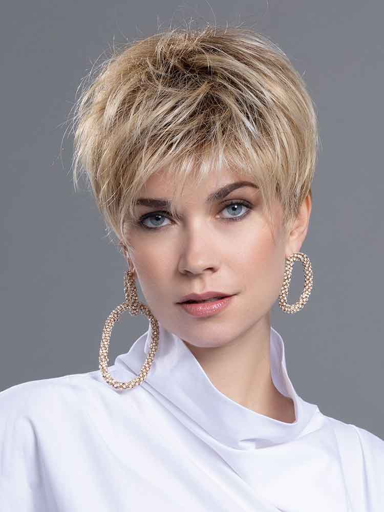 The Elan wig by Ellen Wille High Power Collection is a short, pixie style with longer lengths around the crown area.