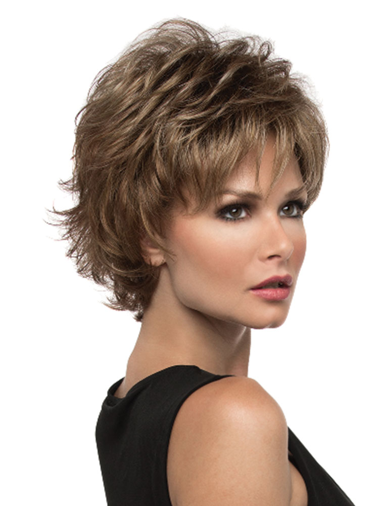 The Hazel wig from Hairware's Natural Collection is a fashion forward layered short style with a soft wispy fringe. Fluff it up or comb in closer for a more subtle appearance.