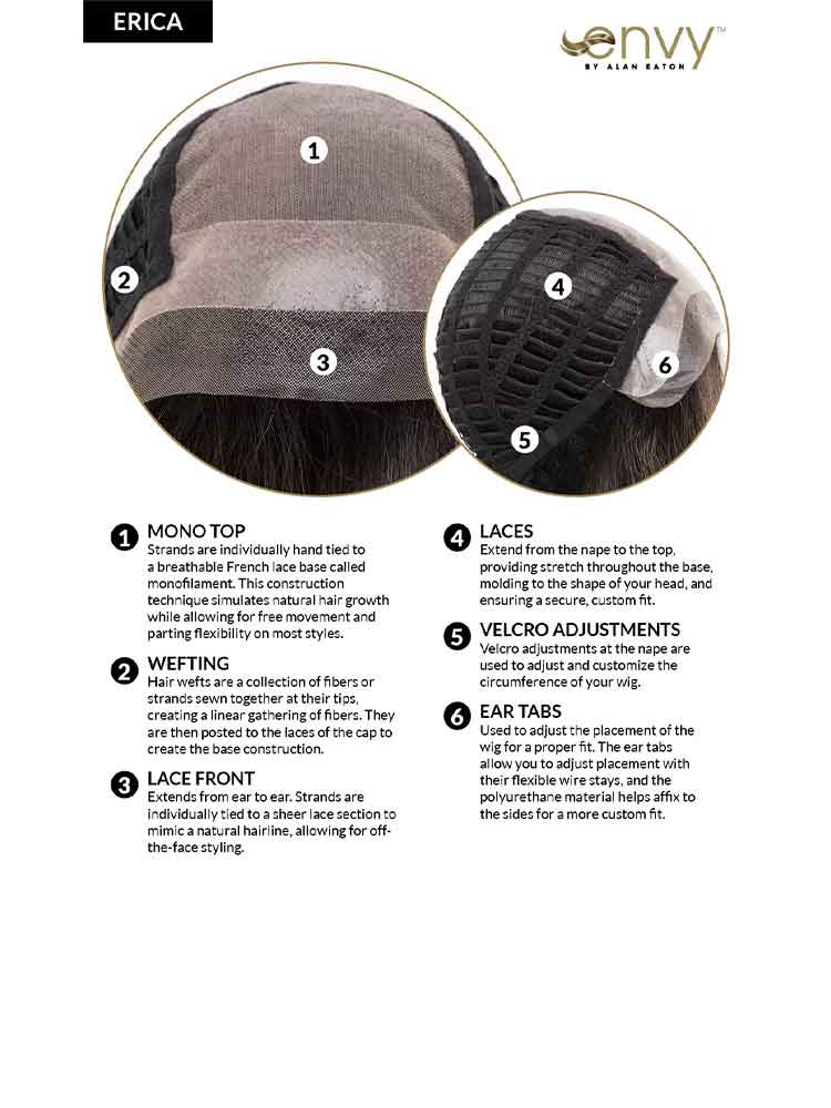 Features include a monofilament top creating the illusion of natural hair growth from the scalp, a soft lace front for an almost undetectable hairline, velvet-lined ear tabs, ultra-thin adjusters at the nape and resilient stretch material throughout the cap base for a custom-like fit.