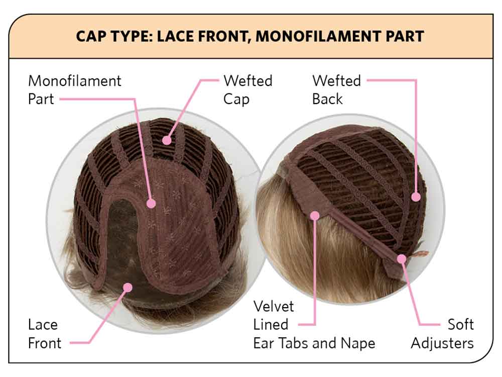 Features include a monofilament parting, a soft lace front for an almost undetectable hairline, velvet-lined ear tabs, ultra-thin adjusters at the nape to ensure a secure fit and resilient stretch material throughout the cap base for a custom-like fit.