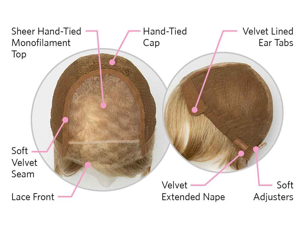 The 100% hand-tied cap is fully adjustable and features a lace front for an almost undetectable hairline finish and a soft monofilament top construction which allows the parting to be moved and creates the illusion of natural hair growth.
