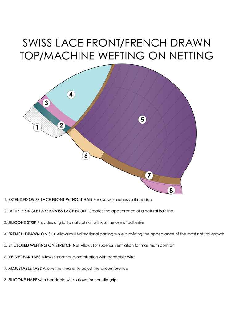 Features include an extended Swiss Lace Front without hair for use with adhesive if needed, Double single layer Swiss Lace Front creating the appearance of a natural hair line, a silicone strip providing a 'grip' to natural skin without the use of adhesive, French Drawn on Silk allowing mulit-directional parting while providing the appearance of the most natural growth, velvet ear tabs allowing smoother customisation with bendable wire, adjustable tabs at the nape allowing you to adjust the circumference and silicone nape with bendable wire, allows for non-slip grip.