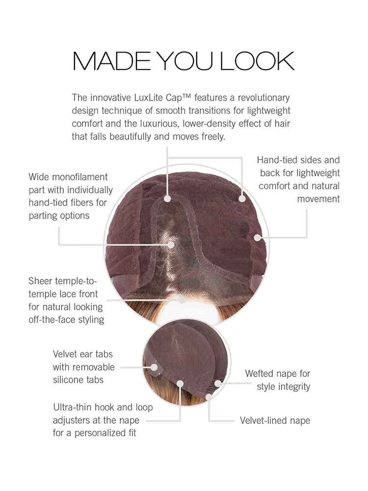 Features include a monofilament parting creating the illusion of natural hair growth at the crown and parting area, an extended temple-to-temple lace front for an almost undetectable hairline, velvet-lined ear tabs, ultra-thin adjusters at the nape and resilient stretch material throughout the cap base for a custom-like fit.