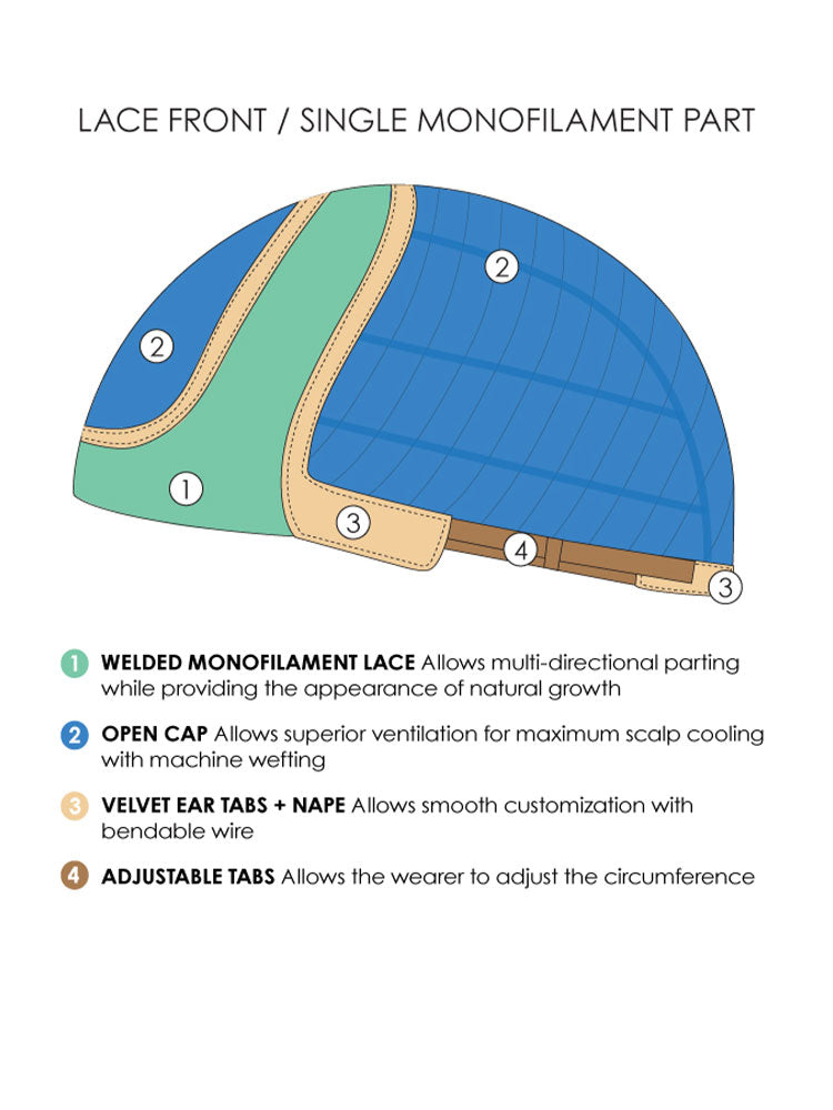 Features include a monofilament part creating the illusion of natural hair growth at the crown and parting area, a soft lace front for an almost undetectable hairline, velvet-lined ear tabs, ultra-thin adjusters at the nape and resilient stretch material throughout the cap base for a custom-like fit.