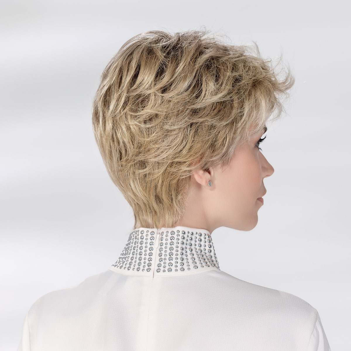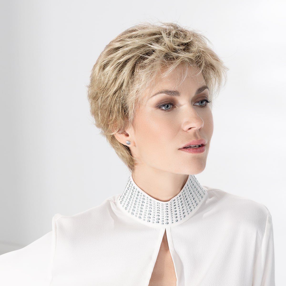 The Posh Deluxe wig by Ellen Wille Hair Society Collection is a short style with fullness and longer lengths on the top and sides. The cap is 100% hand-tied with an extended lace front and monofilament top construction.