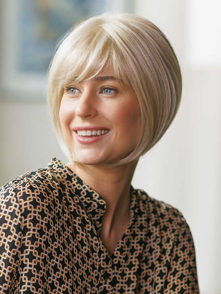 The Sora Large wig by Sentoo Premium Collection is available in 3 cap sizes. This ladies wig is a striking modern angled bob with a soft fringe.