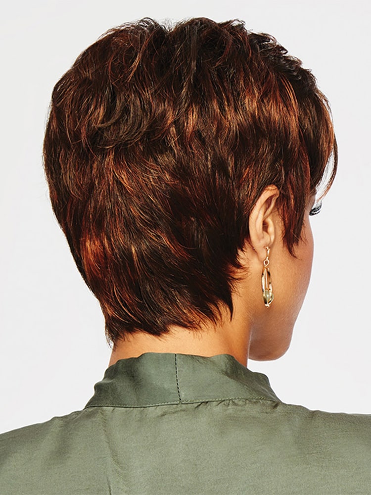 The Winner Large wig by Raquel Welch is a light little pixie cut featuring razor-like tapering of barely waved layers.