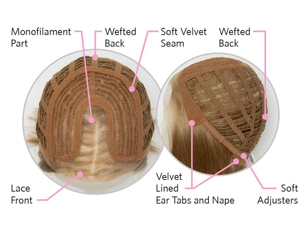 The wefted cap adapts very well to the shape of the head and allows air to circulate. The lightweight cap is fully adjustable and features a lace front, monofilament part construction which creates the illusion of natural hair growth from the crown and parting area.