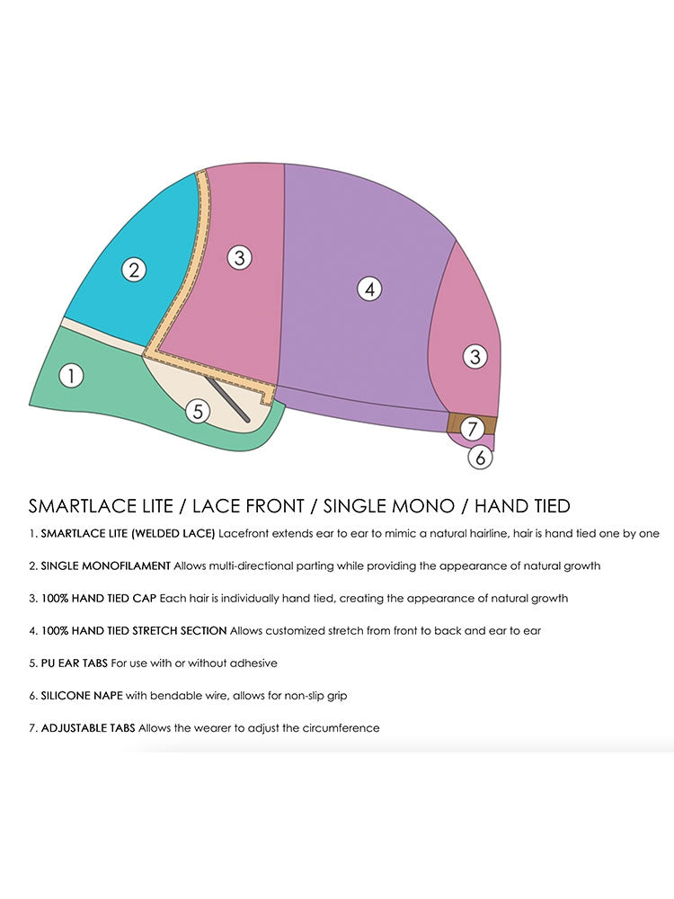 The 100% hand-tied cap is fully adjustable and features an lace front for an almost undetectable hairline finish and a soft monofilament top construction which allows the parting to be moved and creates the illusion of natural hair growth.