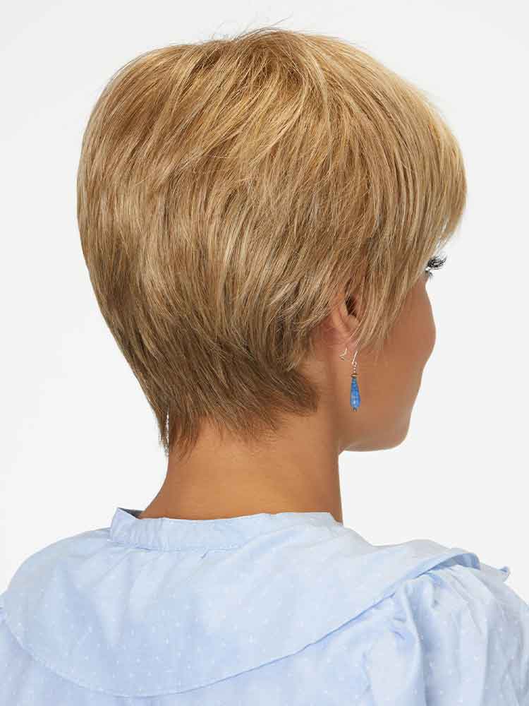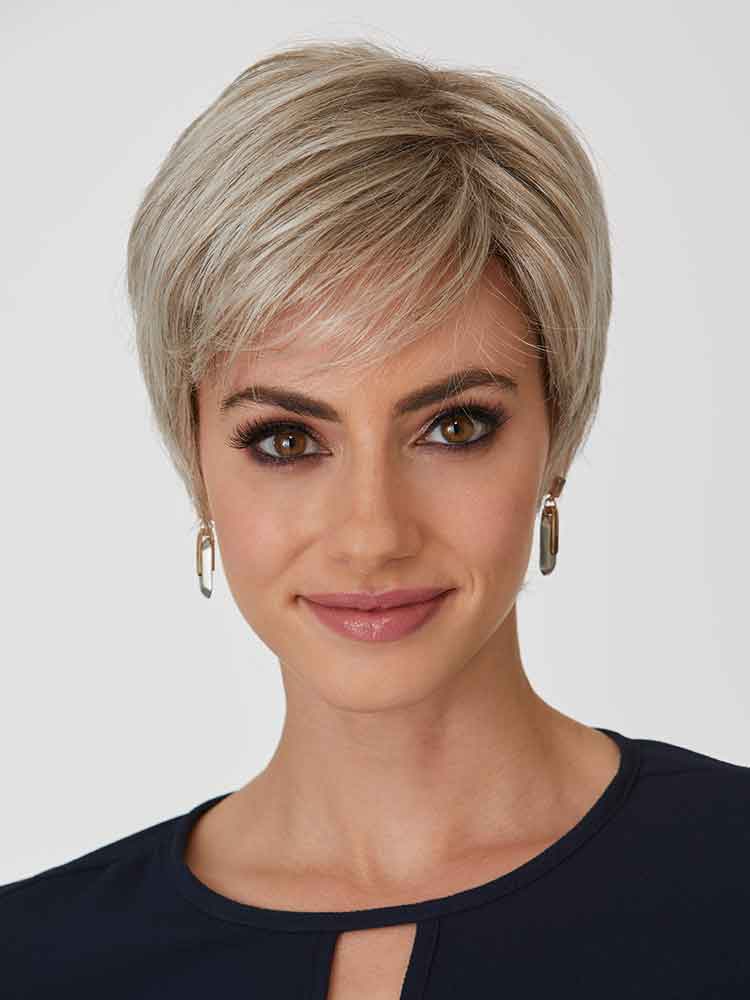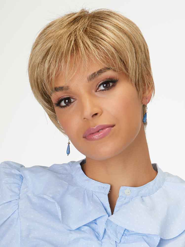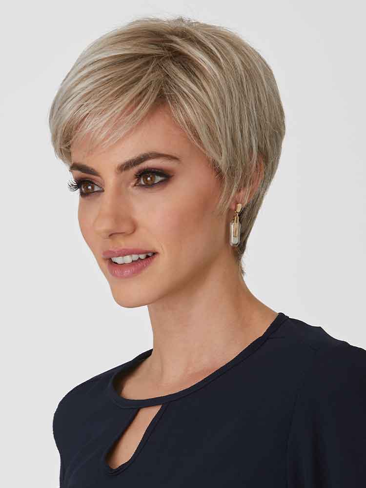 The Zara wig by Natural Image is a short boy cut with lots of textured layers, a soft fringe and longer layers to provide extra coverage around the ears.
