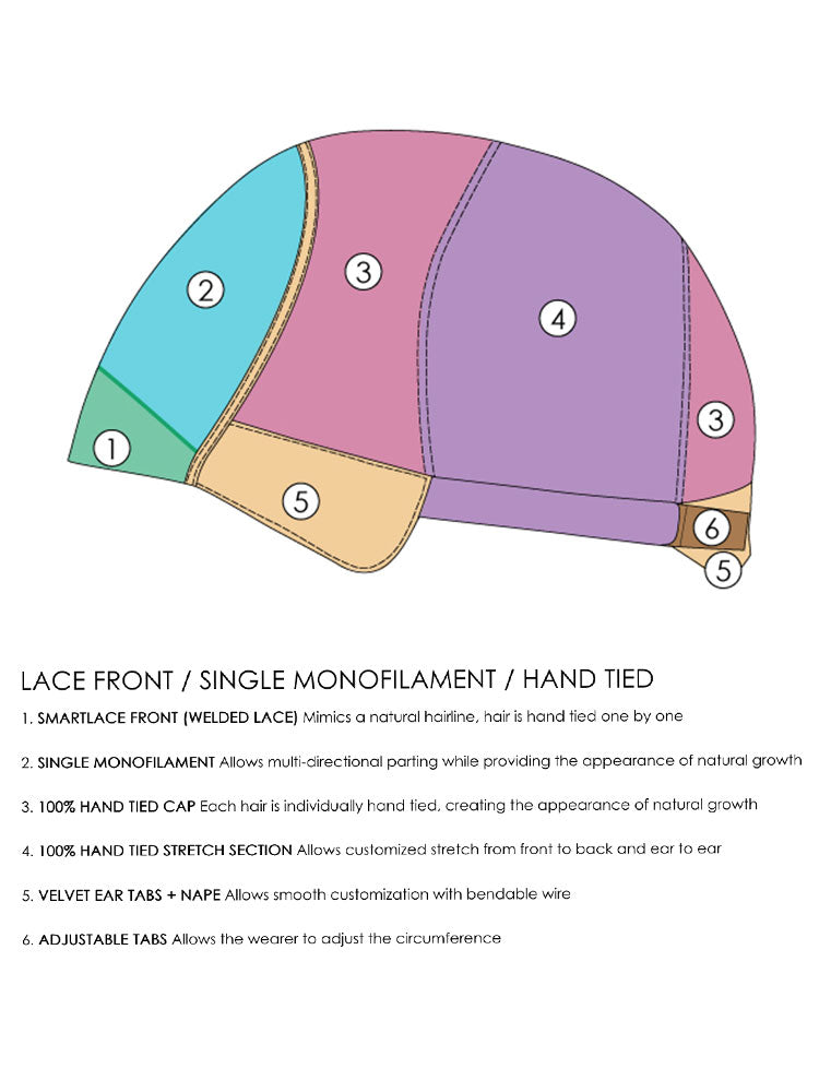 The 100% hand-tied cap is fully adjustable and features a lace front for an almost undetectable hairline finish and a soft monofilament top construction which allows the parting to be moved and creates the illusion of natural hair growth.